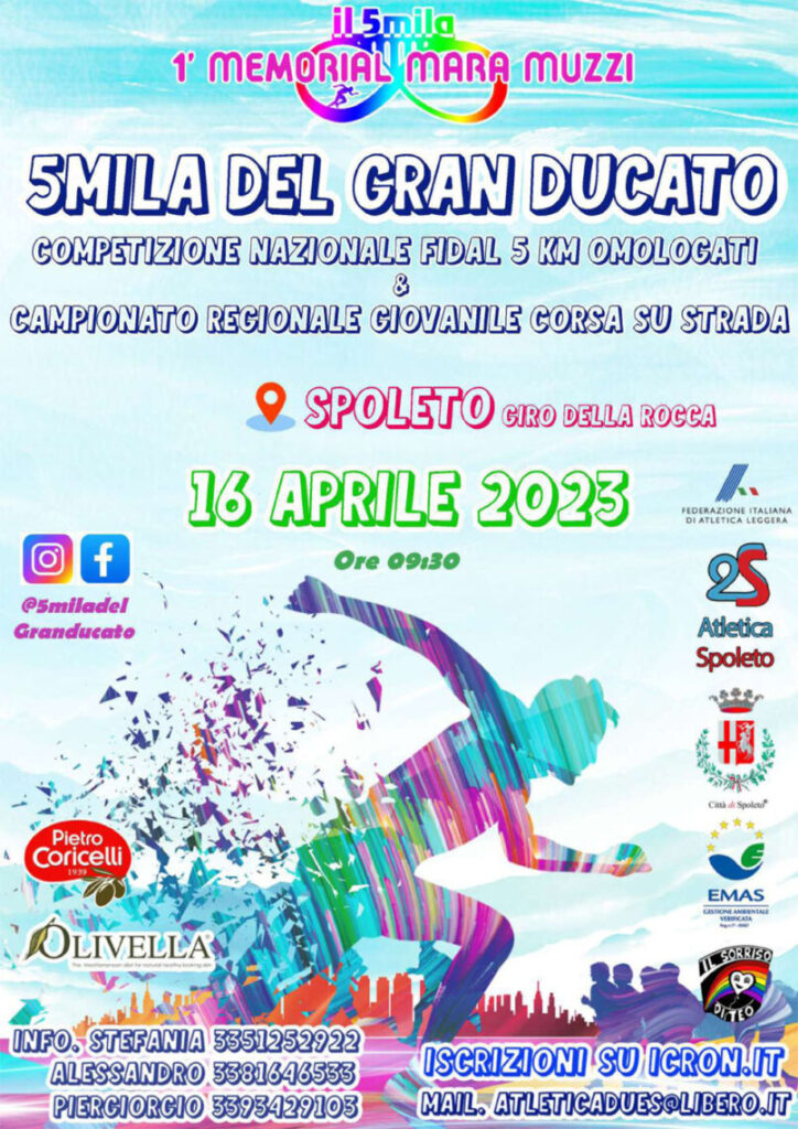 La. A.S.D. 2S Atletica Spoleto, con il patrocinio del Comune di Spoleto ed in collaborazione col Comitato Regionale Fidal Umbria, organizza domenica 16 aprile la manifestazione di atletica leggera di corsa su strada “IL 5MILA DEL GRANDUCATO”, I Trofeo Città di Spoleto e I Memorial Mara Muzzi.