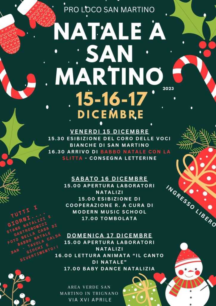 Si inizia venerdì con l’esibizione del coro delle voci bianche della Scuola primaria di San Martino e l’arrivo di Babbo Natale con la slitta, pronto ad accogliere le letterine di bambine e bambini. Sabato andrà in scena l’esibizione di Cooperazione R. a cura della Modern Music School, a seguire tradizionale tombolata. Domenica, una lettura animata ispirata al Canto di Natale di Dickens chiuderà la kermesse.