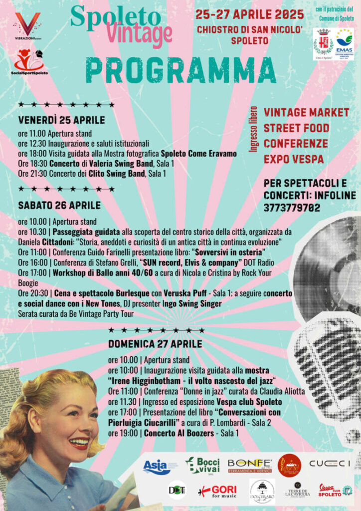 La manifestazione, patrocinata dal Comune di Spoleto ed inserita nel programma di “Accade in primavera a Spoleto”, celebrerà la cultura vintage ed ospiterà quattro concerti di musica degli anni ‘40, ‘50 e ‘60, una mostra mercato con abiti vintage, produzioni artigianali handmade, illustrazione e riciclo creativo di qualità, oltre allo street food.