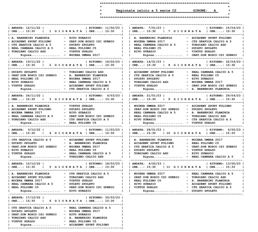 Detto che le squadre del girone saranno undici e che, quindi, una a turno starà a guardare, la Ducato è stata sorteggiata per riposare all’11ma ed ultima giornata. Da calendario si giocherà di sabato, ma quattro squadre hanno fatto richiesta di anticipare al venerdì.