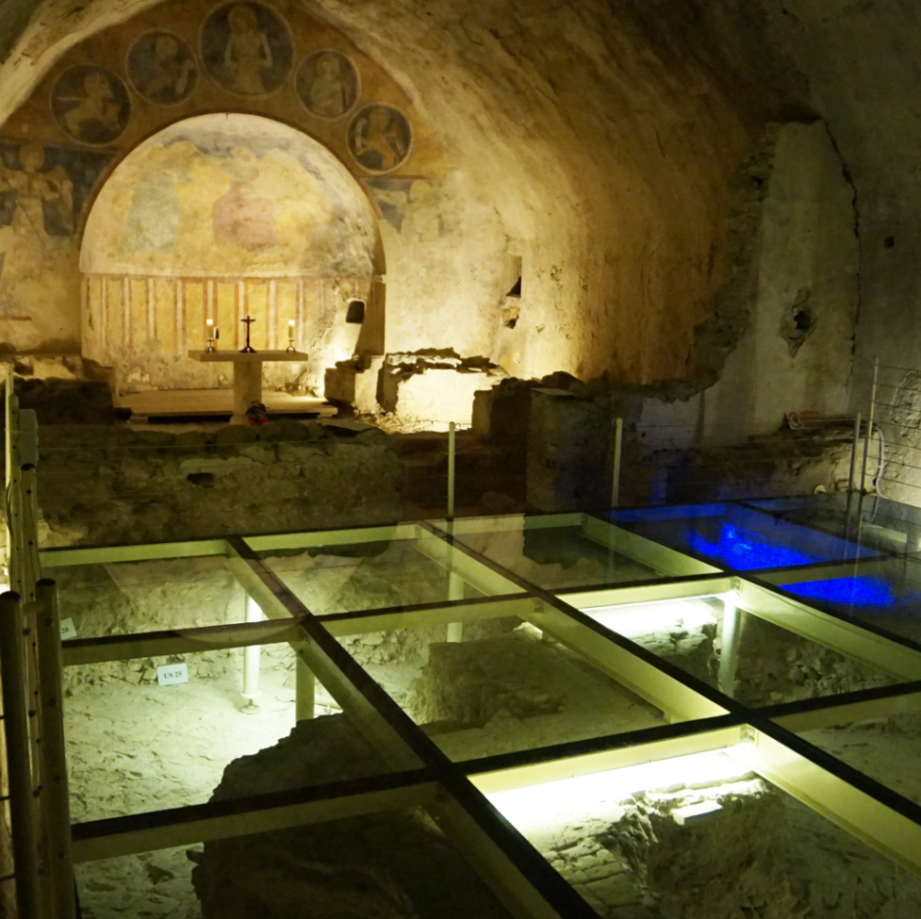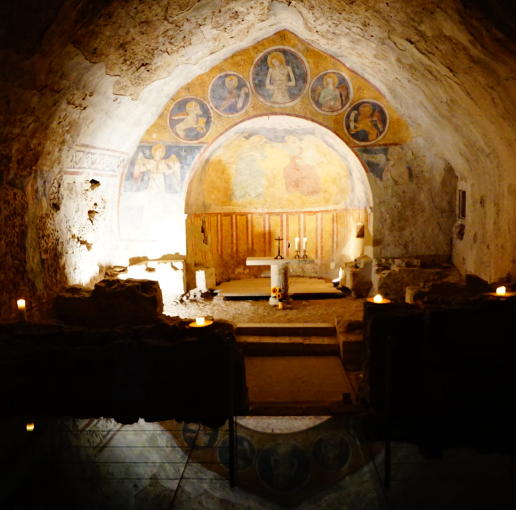 La visita guidata ai sotterranei, scoperti casualmente da sei speleologi nel 1979, inizia con la presentazione di una chiesa del XII secolo, con affreschi spettacolari e ben conservati.