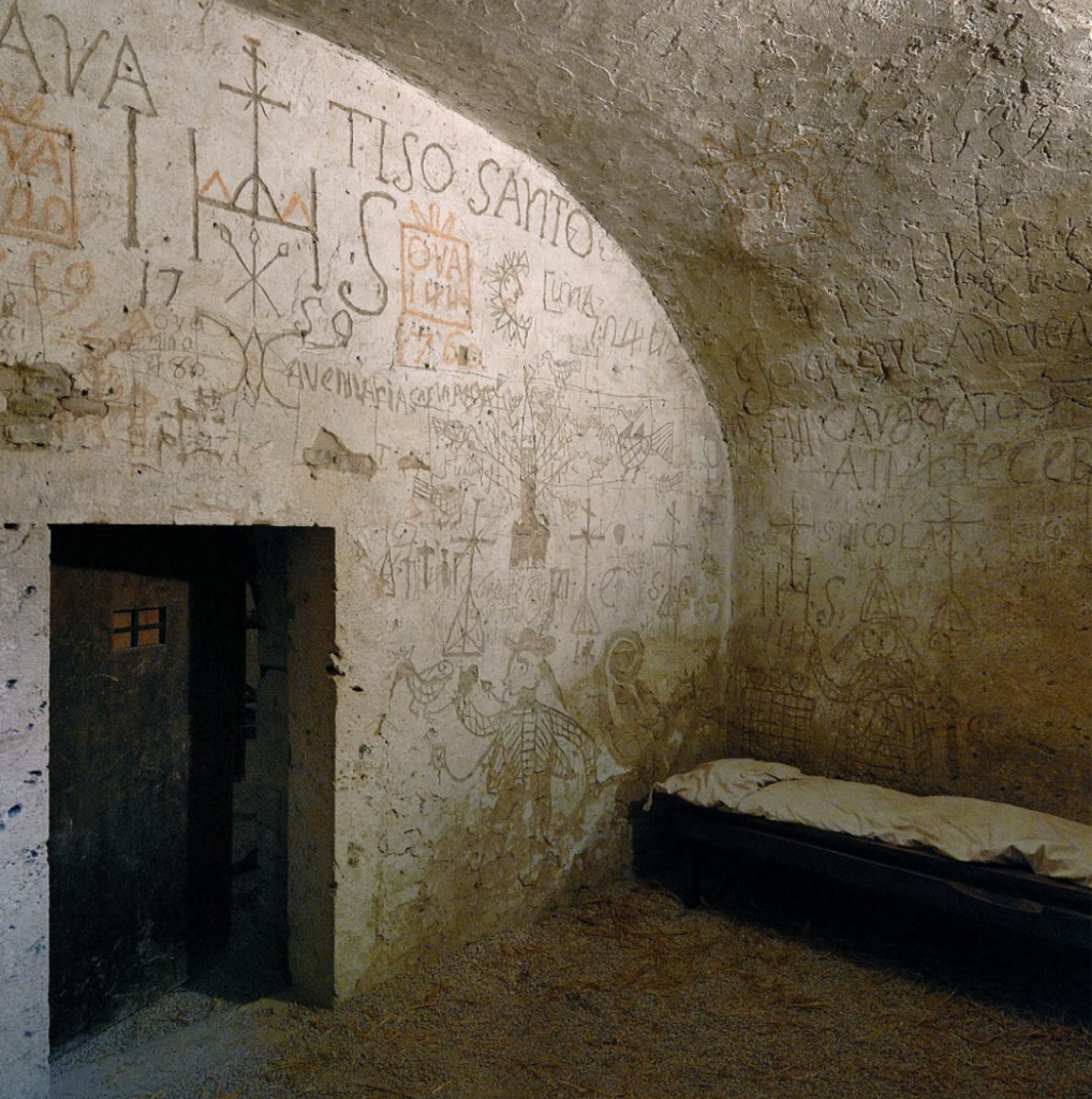 Coperta di graffiti e simboli alchemici e massonici, alcuni dei quali non completamente decriptati, trasmette al visitare tutta la sofferenza della brutale prigionia sofferta dall’inquisito.