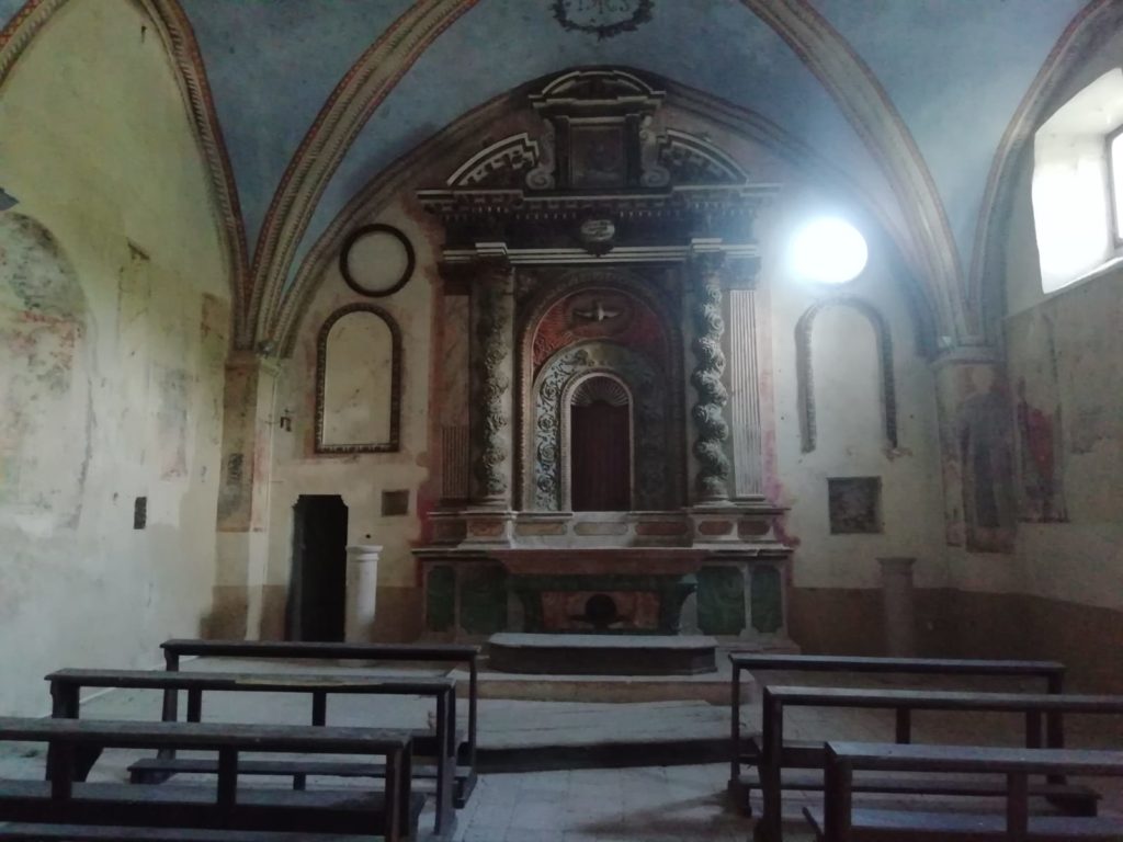 All’ingresso del borgo troviamo un altro edificio di culto molto particolare, la chiesa di Santa Maria della Porta di cui resta visibile l’altare e qualche affresco, essendo stata depredata dei suoi arredi interni e perfino profanata nell’ossario che oggi troviamo divelto e coperto da una trave di legno.