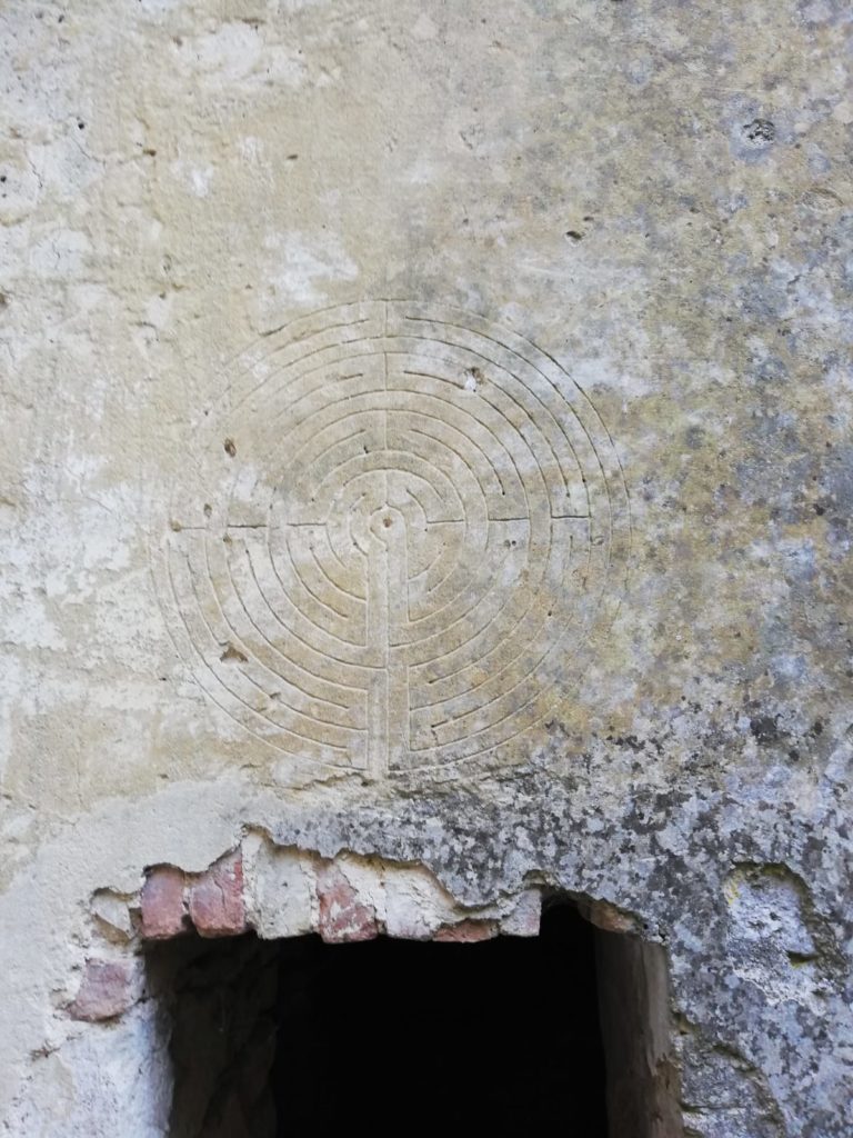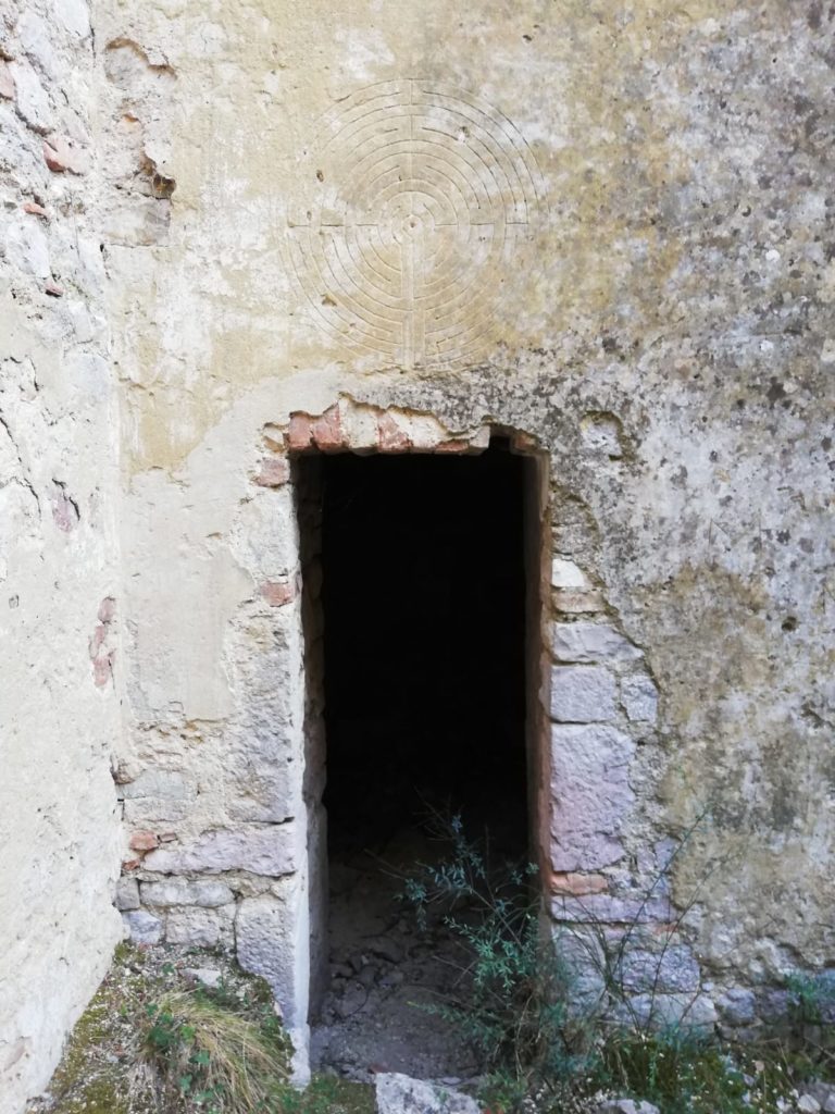 Lo sguardo attonito dell’esploratore viene a questo punto immediatamente carpito da un particolare unico nel suo genere, un labirinto realizzato con grande maestria,inciso nell’intonaco al di sopra della porta che conduce nelle stanze annesse al corpo principale della chiesa.
