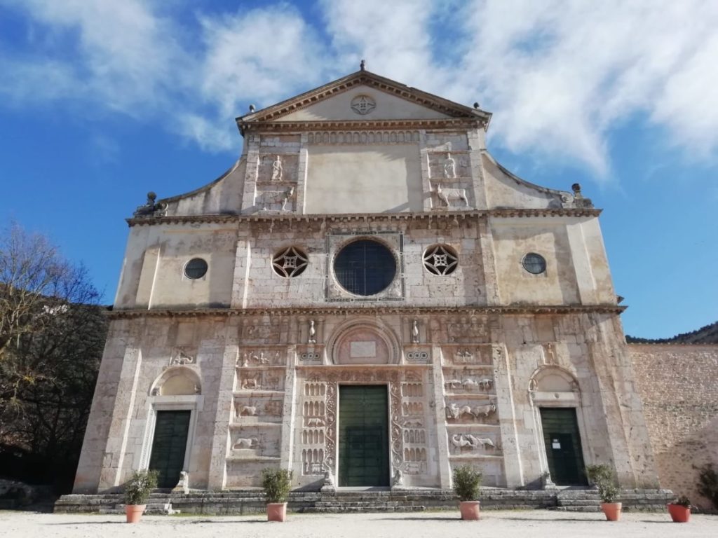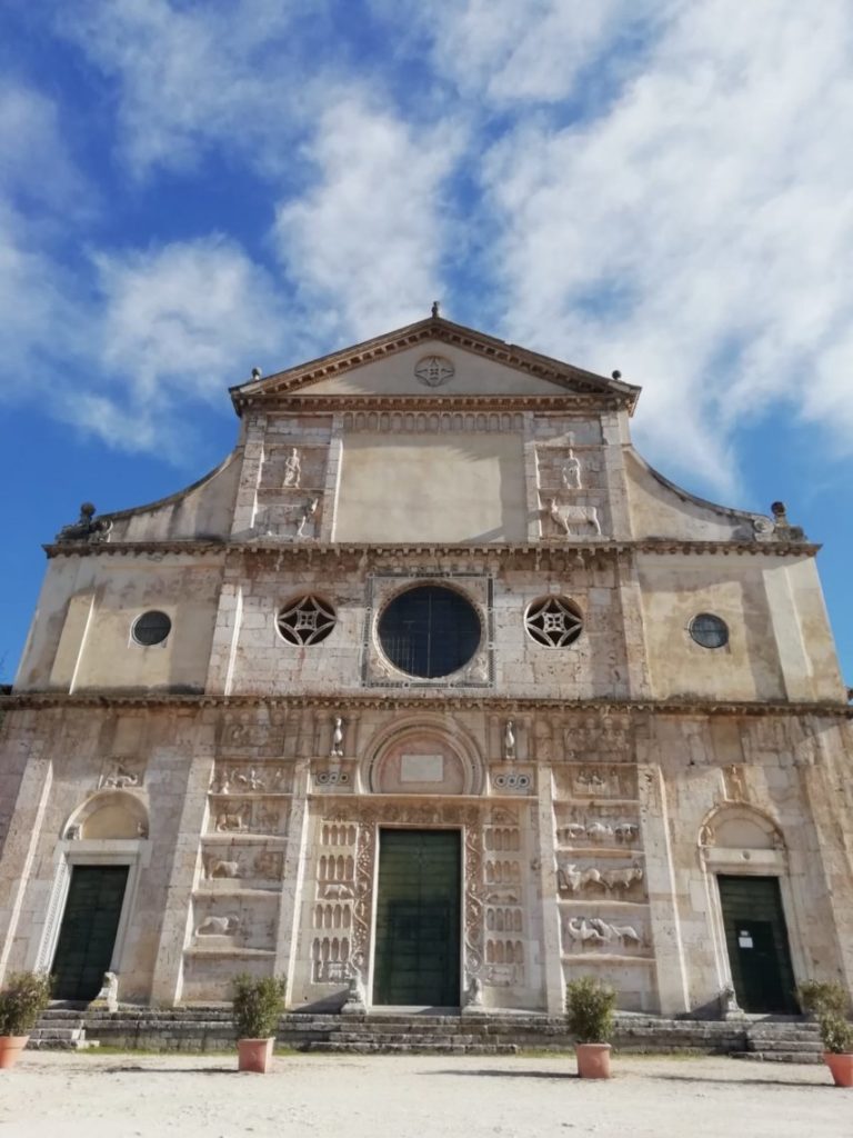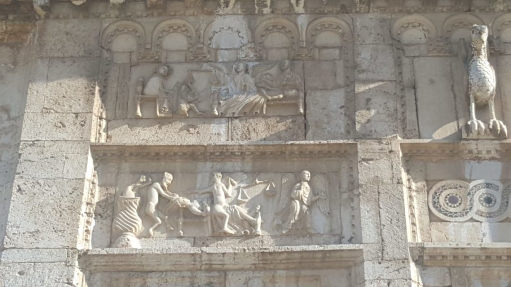 La nostra esplorazione, ha inizio dalle pendici del monte, ovvero dalla bellissima chiesa di San Pietro extra moenia, costruita nel quinto secolo dal vescovo Achilleo. La sua facciata, restaurata nel dodicesimo secolo, è ornata da una serie di bassorilievi che mostrano particolari di vita del Santo e episodi a sfondo morale, che avevano la funzione di impressionare il fedele con la potenza delle immagini.
