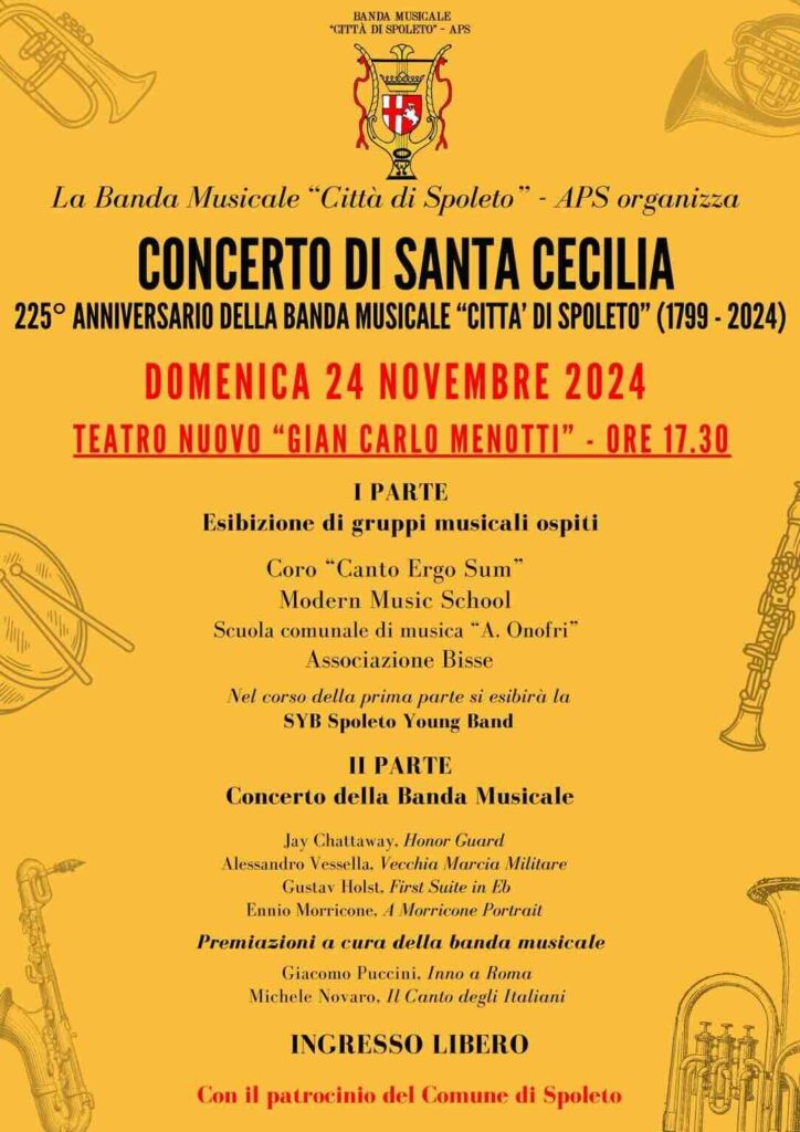 La Banda musicale «Città di Spoleto» compie 225 anni e per celebrare questo importante anniversario torna al Teatro Nuovo «Gian Carlo Menotti» (domenica 24 novembre, ore 17.30) con un concerto speciale, che rappresenta anche un momento di condivisione con le varie realtà musicali del territorio. L’evento, che gode del patrocinio del Comune di Spoleto, coincide con i festeggiamenti di Santa Cecilia, patrona della musica e dei musicisti: una ricorrenza molto sentita e che da più di dieci anni non veniva più celebrata adeguatamente per questioni organizzative, dovute perlopiù agli elevati costi di noleggio degli spazi.