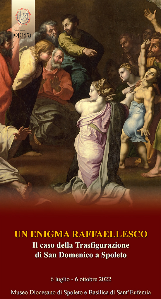 Dal 6 luglio al 6 ottobre 2022 la Basilica di Sant’Eufemia ospiterà la mostra “Un enigma raffaellesco: il caso della Trasfigurazione di San Domenico a Spoleto”. La grande pala d’altare della chiesa di S. Domenico a Spoleto, che ha come soggetto e modello la Trasfigurazione realizzata da Raffaello per il Cardinale Giulio de’ Medici, torna ad essere ammirata e ci pone davanti all’affascinante dubbio se l’attribuzione al Cavalier D’Arpino, come tradizione vuole, sia vera oppure se sia indice di una derivazione diretta dell’opera dalla Bottega di Raffaello. L’opera del grande maestro urbinate, conservata nella Pinacoteca Vaticana, presenta infatti moltissime somiglianze con la pala spoletina.