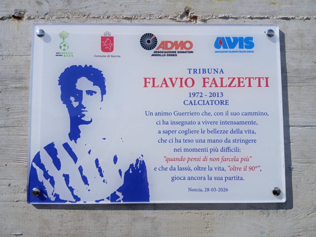 “Le cure sono importanti, è vero, ma è anche fondamentale avere un animo guerriero. Perchè deve essere la mente, e non l’inverso a dominare la malattia. Questo è ciò che ha permesso il mio ritorno alla vita”. In questa frase stampata sulla contro copertina del libro “Oltre il 90°”, la biografia di Flavio Falzetti raccolta dal giornalista marchigiano Francesco Caremani, è racchiuso il senso della battaglia di questo ragazzo nursino contro quella che lui chiamava la “bestia”. Tornare a giocare dopo 35 cicli di chemioterapia, era stata la Champions League di Flavio; il suo Tourmalet. Da ieri, la sua Norcia,la città che Flavio amava sopra ogni altra cosa e di cui vantava le origini in ogni luogo in cui si recasse per diffondere, dapprima il verbo del calcio e poi quello della sua lotta per la vita, gli ha riservato un posto d’onore nella memoria. Intitolandogli le tribune del campo sportivo “Micheli”. Ed è stata una semplice ma suggestiva cerimonia quella alla quale sono intervenuti, tra gli altri, il sindaco Giuliano Boccanera, il consigliere regionale Stefano Lisci, che ha portato i saluti della presidente della Regione, Stefania Proietti, l’assessore comunale allo sport ed al welfare, Sabrina Palazzeschi, la quale ha ricordato Flavio Falzetti e riassunto il significato del convegno “Oltre il 90°” con parole semplici ma che hanno toccato le corde dell’anima, i consiglieri comunali Giuseppina Perla ed Andrea Russo, in rappresentanza della maggioranza, e Cristina Sensi per la minoranza. Il Comitato umbro della Figc è stato rappresentato dal vice presidente Carlo Emili, che ha rivolto parole di apprezzamento per quanto sta facendo la locale società calcistica. In quella lapide scoperta dalle sorelle Monia e Luisa, sorelle di Flavio, e quindi benedetta dal parroco di Norcia, don Davide Tononi, come ha sottolineato il primo cittadino: “C’è l’orgoglio di una città nell’aver avuto tra i suoi figli un ragazzo coraggioso e generoso come Flavio, che amava la vita e che ha voluto spenderla intensamente sino all’ultimo dei suoi giorni per il bene altrui”. Norcia, a distanza di 13 anni dalla scomparsa di Flavio, paga così il suo “debito di riconoscenza” verso questo piccolo, grande eroe, dei nostri tempi.