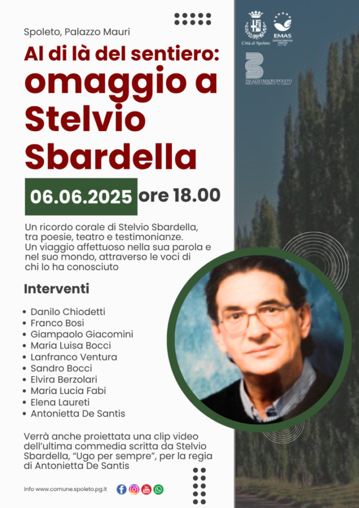 Verranno inoltre letti ricordi scritti dalla sorella Giuseppina Maria Sbardella e dalla professoressa Elena Laureti, presidente del Centro studi Frezzi di Foligno, sull’esperienza teatrale che ha avuto con Stelvio Sbardella nel 2009 grazie alla riduzione del poema Quadriregio di Federico Frezzi (1345-1416).