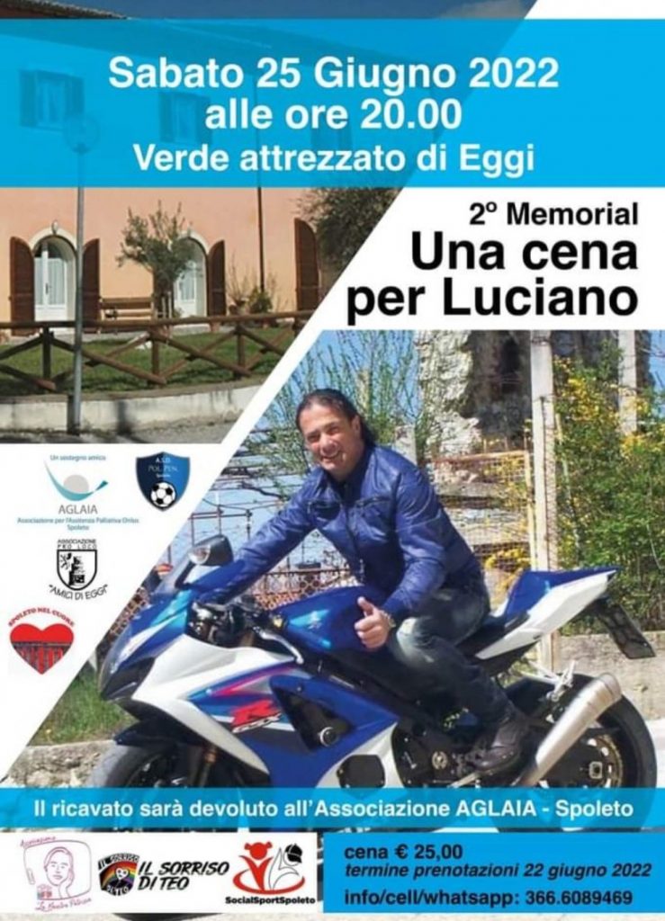 (DMN) Spoleto – l’associazione Proloco Amici di Eggi, sabato 25 giugno, alle 20, organizza il 2° Memorial “Una cena per Luciano”. Un’occasione per ricordare Luciano Staffa, scomparso prematuramente e fare beneficenza. Tutte le info nella locandina.