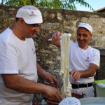 Ben 80 kg di ricotta in un’enorme cesta di vimini, intrecciata a mano da Genesio Rosati, e una pasta all’amatriciana nel segno della solidarietà tra paesi colpiti dal terremoto: si è conclusa così ieri pomeriggio la manifestazione Fior di Cacio, la rassegna dedicata alle produzioni casearie che anche quest’anno ha visto il piccolo borgo di Vallo di Nera invaso da migliaia di persone per due giorni. Ad attendere in piazza l’arrivo dei Cavalieri della tavola apparecchiata che hanno accompagnato la Maxi ricotta cera anche l’ex Presidente del Consiglio Massimo D’Alema. Il noto politico, presente a Fior di Cacio come espositore con la sua cantina vinicola che ha sede ad Otricoli, si è prestato simpaticamente a servire ai tantissimi presenti la ricotta. Ma l’enorme latticino, offerto dal Caseificio Caponera di Colfiorito, è stato solo il culmine di un evento anche quest’anno ricchissimo di iniziative per tutti i gusti, tra educational, attività per bambini (particolarmente applaudito lo spettacolo di Mirko Revoyera), degustazioni e dimostrazioni della lavorazione della mozzarella, ma anche lo show coking Cacio e pepe. Le meravigliose voci di Edson D’Alessandro e Martina Barone hanno incantato il pubblico sabato sera, mentre domenica ad animare le vie del paese ci ha pensato la coinvolgente Soloband di Perugia. Tra le iniziative più significative quella dedicata alla ricotta salata della Valnerina, per cui è stato avviato l’iter per il riconoscimento come presidio Slow food. Ma la condotta della Valnerina insieme all’associazione regionale come hanno spiegato il presidente Sergio Consigli e la segretaria Monica Petronio stanno lavorando anche al riconoscimento di altri due presidi, i fagioli monachelle ed il grano saraceno.