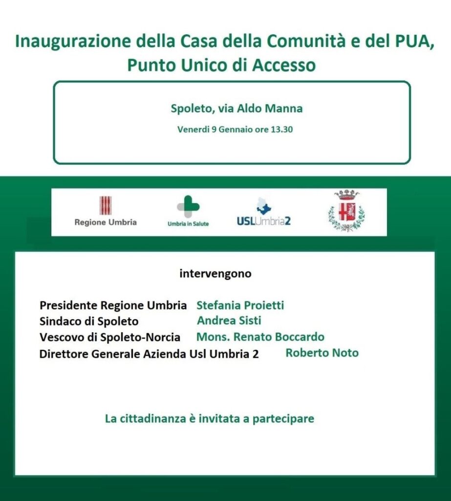 Taglio del nastro, venerdì prossimo 9 gennaio alle 13.30, della Casa della Comunità e del PUA, Punto Unico di Accesso ai servizi socio sanitari di Spoleto dell’Azienda Usl Umbria 2, in via Aldo Manna.