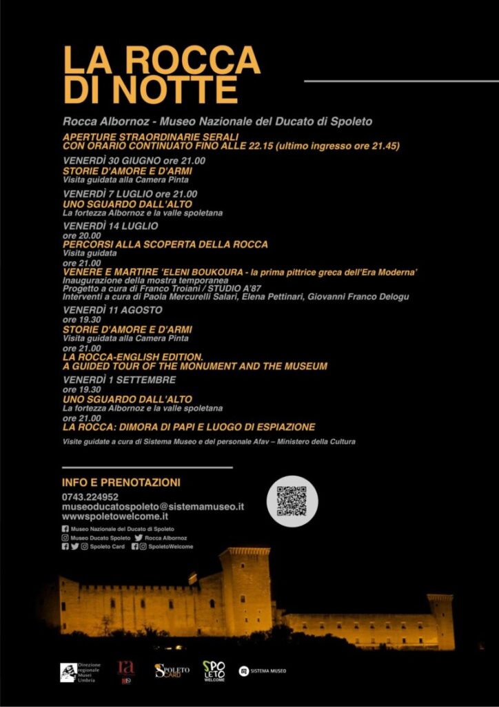 Con “Storie d’armi e d’amore”, visita guidata, alle ore 21, alla Camera Pinta comincia domani, venerdì 30 giugno, un ciclo di aperture straordinarie notturne, con orario continuato fino alle 22.15 (ultimo ingresso alle 21.45), al Museo nazionale del Ducato di Spoleto – Rocca Albornoz. Per info e prenotazioni: 0743 224952.